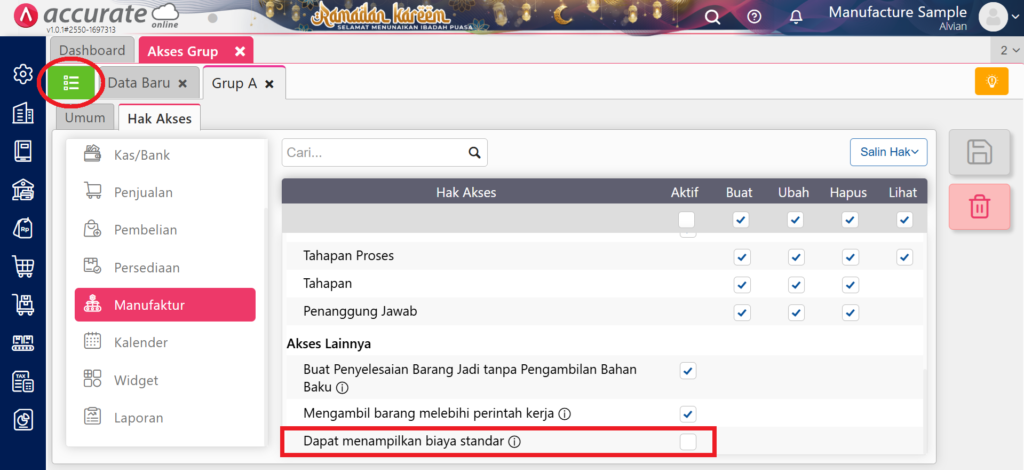 Dalam proses manufaktur, sering kali hanya level tertentu yang diizinkan untuk melihat informasi biaya atau harga standar. Untuk menjaga kerahasiaan data keuangan, Anda bisa membatasi pengguna Operator agar tidak dapat melihat harga standar pada formulir Formula Produksi dan Perintah Kerja di Accurate Online.