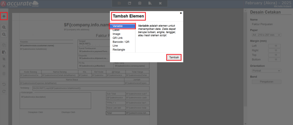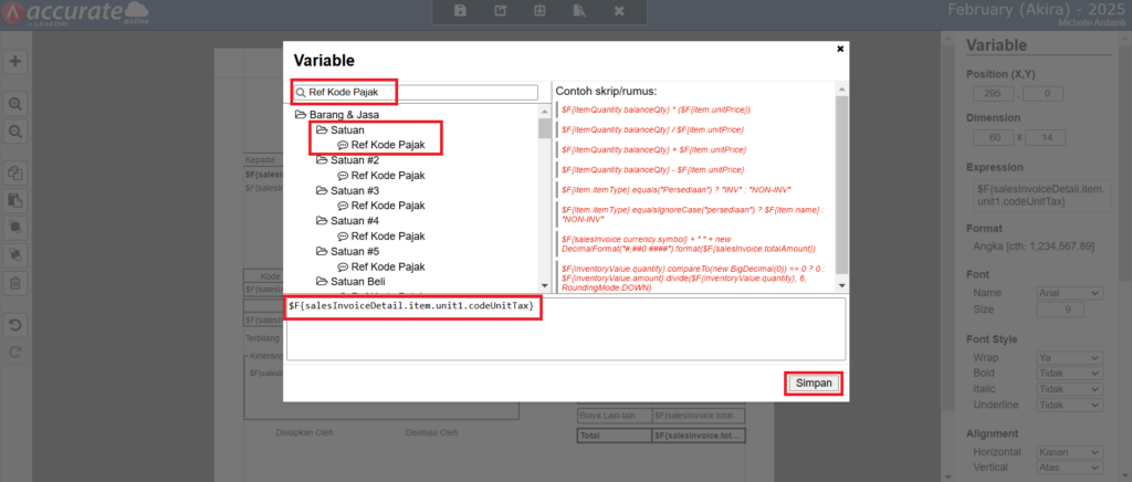 Berikut adalah panduan lengkap untuk menambahkan informasi Ref. Kode Pajak pada desain cetakan faktur penjualan: