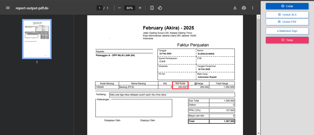 Jika langkah-langkah di atas dilakukan dengan benar, maka saat Anda mencetak faktur penjualan menggunakan desain cetakan tersebut, akan muncul informasi Ref. Kode Pajak (Satuan) Barang pada detail barang. Hal ini membantu memastikan transaksi lebih transparan dan memudahkan proses verifikasi pajak.