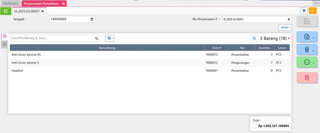 Rumus ini akan otomatis menjumlahkan nilai total dari seluruh detail penyesuaian barang, baik penambahan maupun pengurangan.