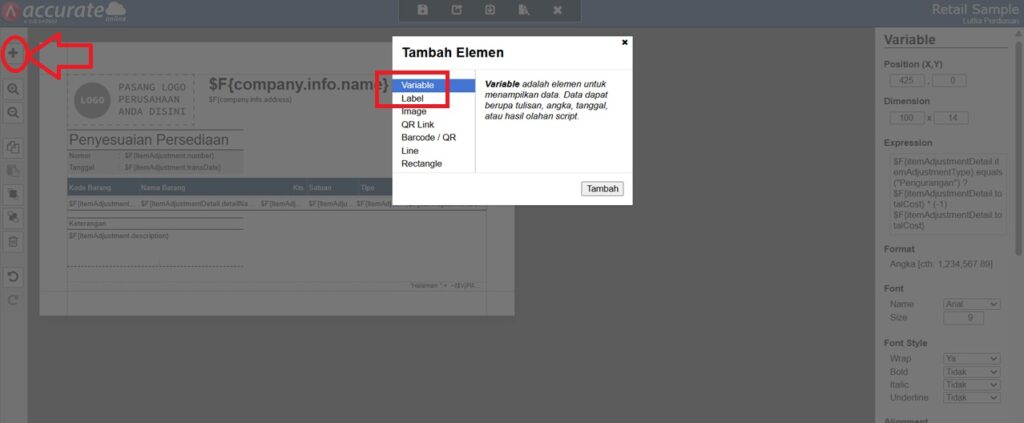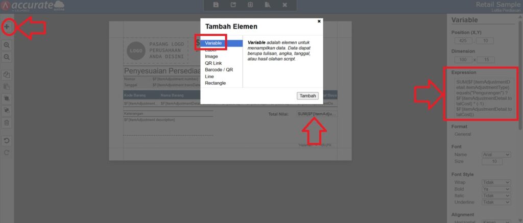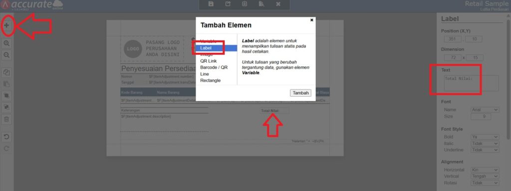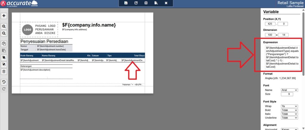 Berikut panduan detail untuk menampilkan total nilai persediaan pada desain cetakan penyesuaian persediaan di Accurate: